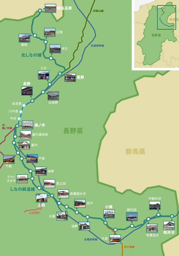 長野県の東西を横断し、軽井沢(ショッピングモール)、小諸(懐古園)、上田(上田城跡)、戸倉(戸倉上山田温泉)、長野(善光寺)、黒姫(野尻湖)等の様々な観光地を結んでいます。県内外の観光客やインバウンド客が魅力ある様々な地域へ訪れるための重要な交通手段です。